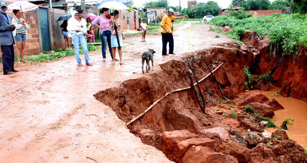 Todos os anos os moradores dos bairros Domingos Peixoto e Dona Eloina sofrem muito com problemas que parecem não ter fim. Crateras abertas no meio das ruas estão tirando o sono das pessoas. Na Rua Taiobeiras, bairro Dona Eloina existe uma grande lagoa. A água acumulada não só dificulta a passagem de veículos e pedestres, mas está infiltrando nas moradias e provocando rachaduras. Já nas ruas B e O, no bairro Domingos Peixoto, existe uma cratera que está quase engolindo as casas. O buraco tem mais de 5 metros de largura, cerca de 2 metros e meio de profundidade e está há 4 metros e meio das casas. Os moradores estão desesperados e pedem socorro.